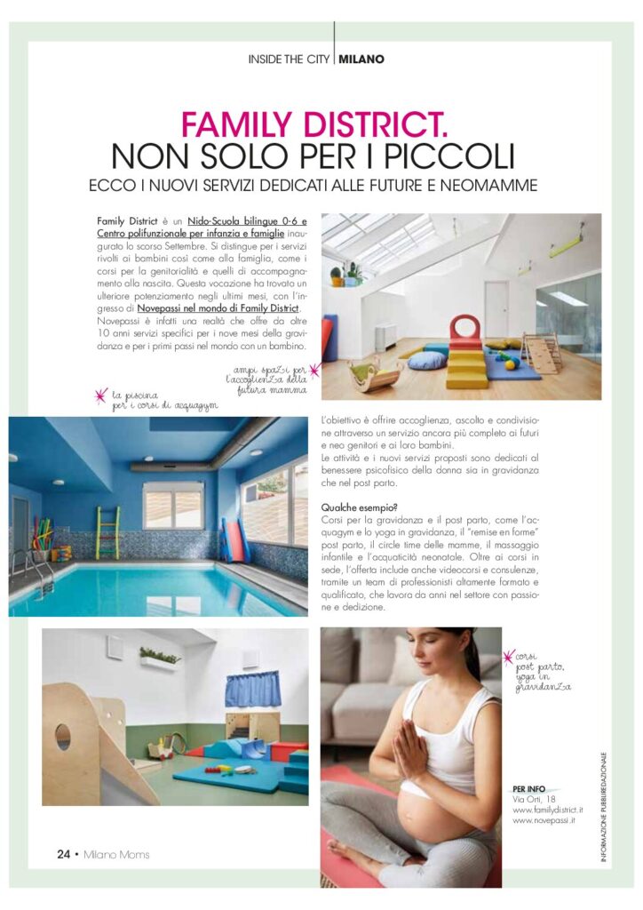 Novepassi, centro polispecialistico specializzato nella gravidanza, si dedica al benessere psicofisico delle donne, delle neo-mamme e dei bambini da oltre 10 anni. Dal 2024, diventa parte integrante di Family District, un Nido-Scuola bilingue per bambini da 0 a 6 anni e un centro polifunzionale per l’infanzia e le famiglie nel cuore di Milano.